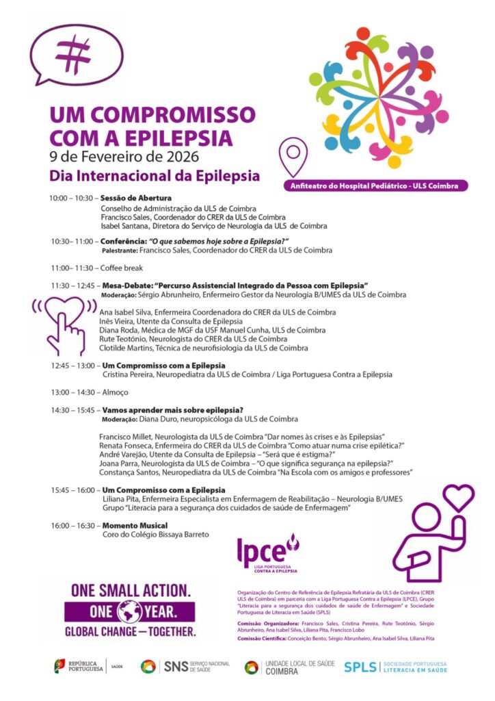 No próximo dia 9 de fevereiro de 2026, o Anfiteatro do Hospital Pediátrico da ULS de Coimbra acolhe a iniciativa “Um Compromisso com a Epilepsia”, organizada pelo Centro de Referência de Epilepsia Refratária (CRER) da ULS de Coimbra, em colaboração com a Liga Portuguesa Contra a Epilepsia (LPCE), o Grupo “Literacia para a Segurança dos Cuidados de Saúde de Enfermagem” da ULS de Coimbra e a Sociedade Portuguesa de Literacia em Saúde (SPLS).