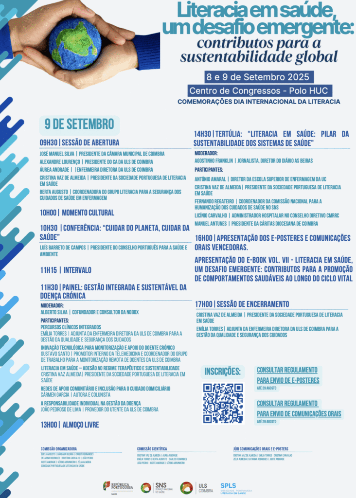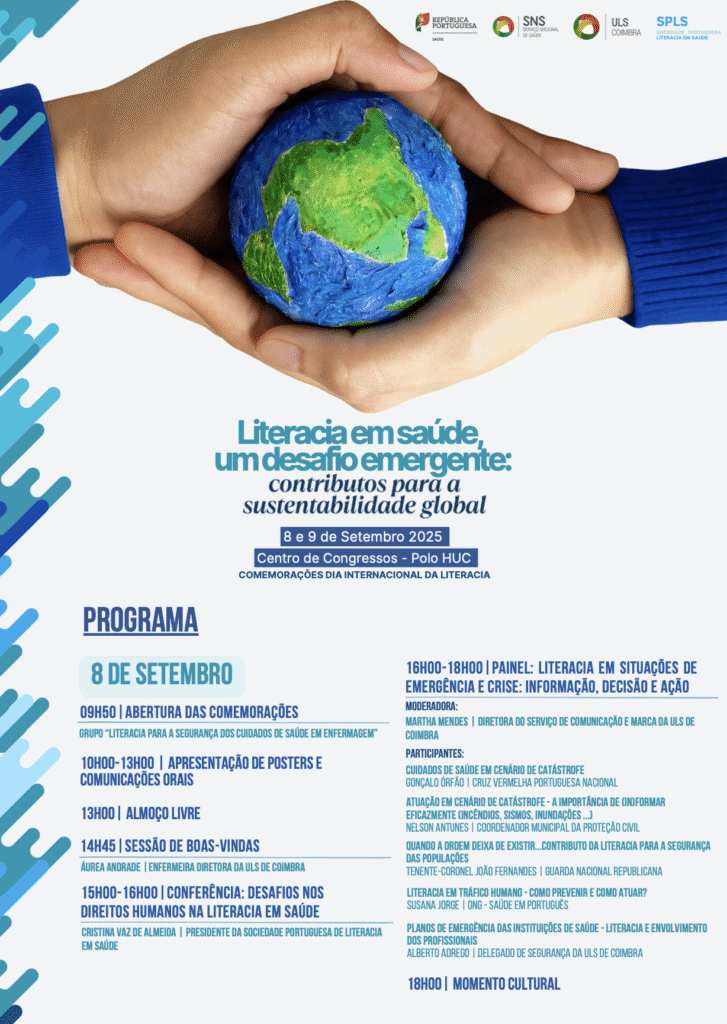 Nos dias 8 e 9 de setembro de 2025, o Centro de Congressos – Polo HUC recebeu as Comemorações do Dia Internacional da Literacia em Saúde, numa organização conjunta entre a Unidade Local de Saúde de Coimbra (ULS Coimbra) e a Sociedade Portuguesa de Literacia em Saúde (SPLS).